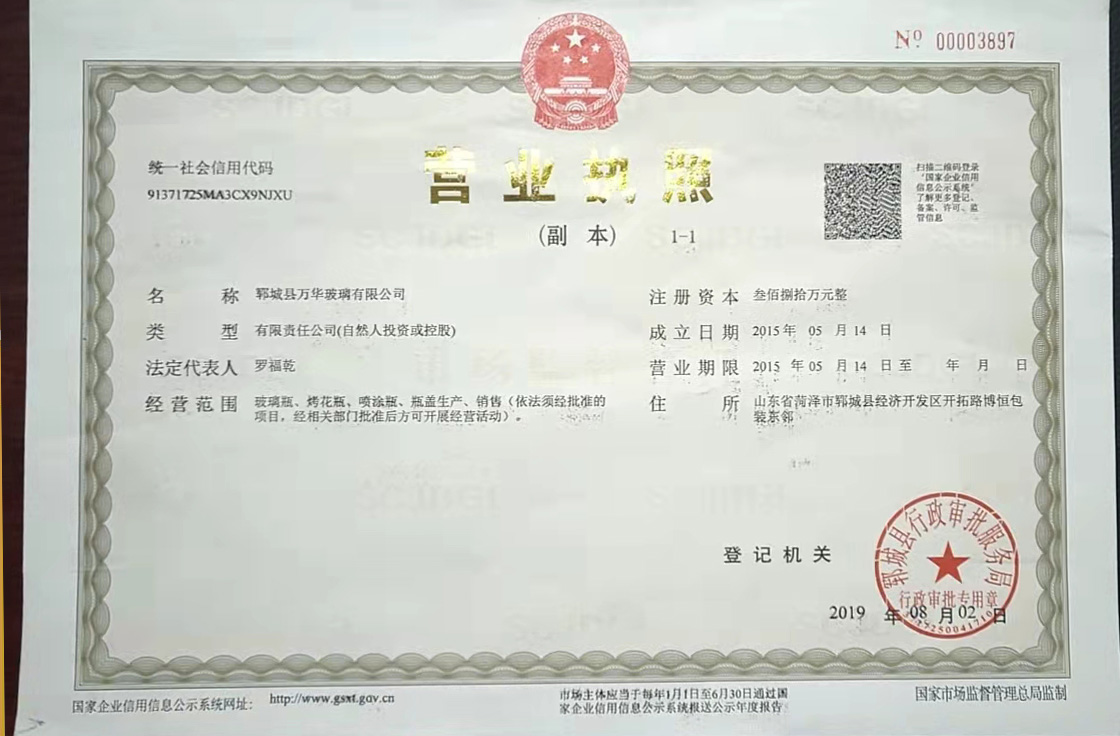 鄆城縣萬(wàn)華玻璃有限公司是生產(chǎn)一家生產(chǎn)玻璃酒瓶及綜合性日用玻璃容器制造公司,緊靠220國(guó)道,北鄰《水滸》之源----水泊梁山;南依國(guó)花之鄉(xiāng)----曹州牡丹園;京九鐵路和日東高速縱橫全境,交通便利,人杰地靈。
